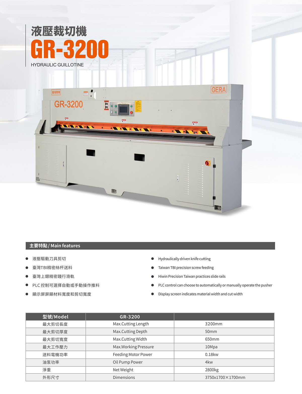 Hydraulically driven knife cutting Taiwan TBl precision screw feeding Hiwin Precision Taiwan practices slide rails PLC control can choose to automatically or manually operate the pusher Display screen indicates material width and cut width |